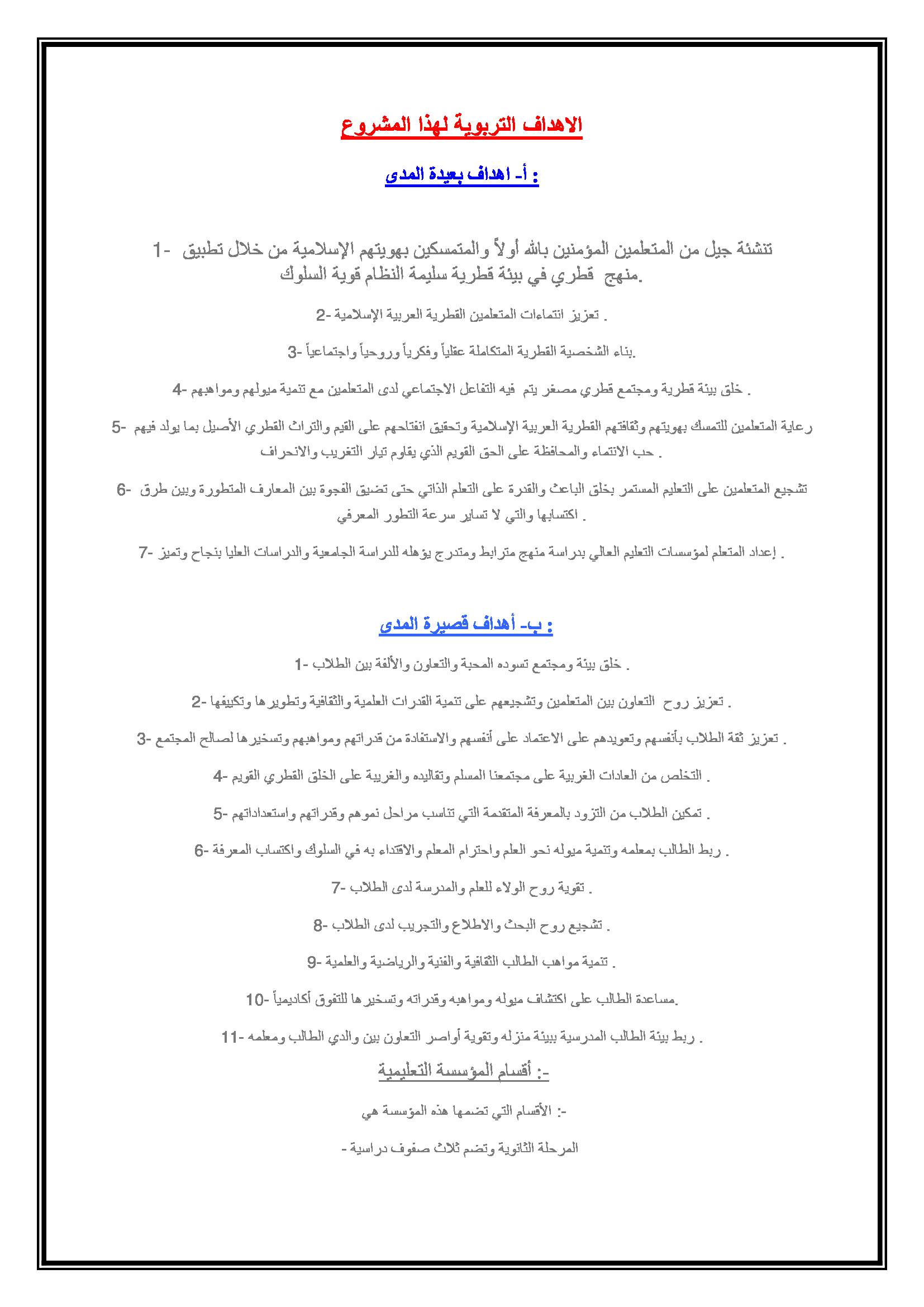 1- تنشئة جيل من المتعلمين المؤمنين بالله أولاً والمتمسكين بهويتهم الإسلامية من خلال تطبيق منهج قطري في بيئة قطرية سليمة النظام قوية السلوك.